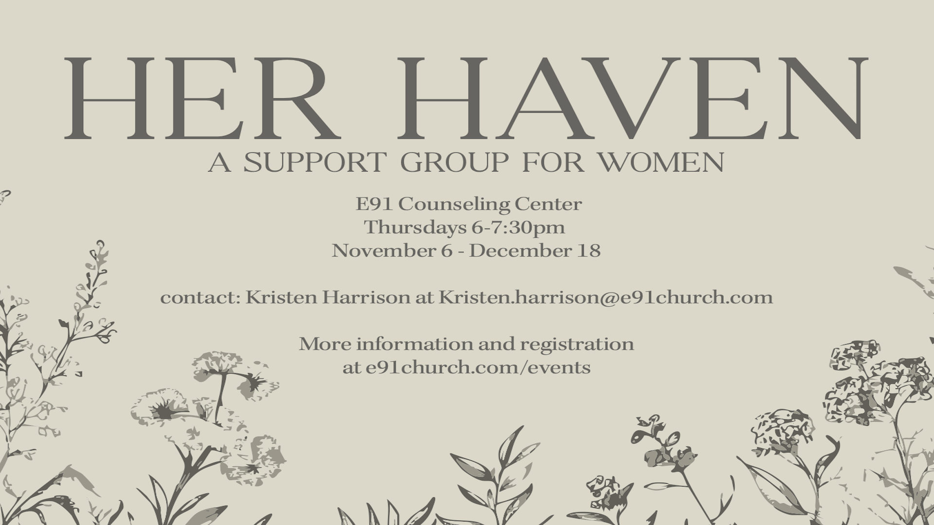 Her Haven is a supportive community where women can come as they are and find encouragement, understanding, and connection. This group exists to create a safe space for sharing life’s challenges and celebrating victories, both big and small. Through meaningful conversations, compassionate listening, and uplifting support, we walk alongside one another in the journey of growth and healing. The group is facilitated by a counselor at E91 Counseling Center.