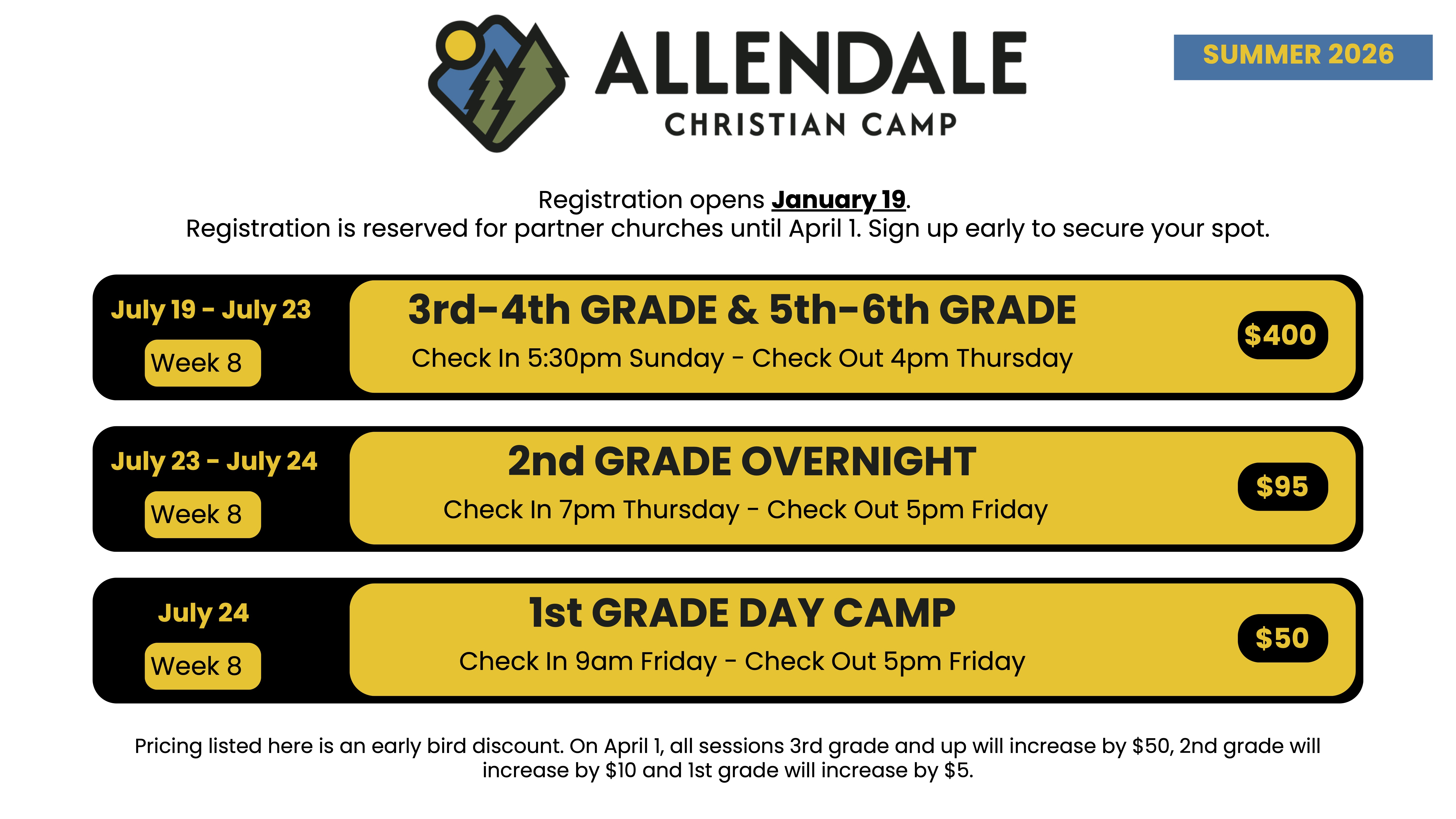 Join us at Camp Allendale, where kids will discover God’s love through engaging Bible stories, hands-on activities, and lots of fun. It’s a time to get away from normal routine to engage with God and others for a time of worship, learning, friendship, and unforgettable summer fun!
