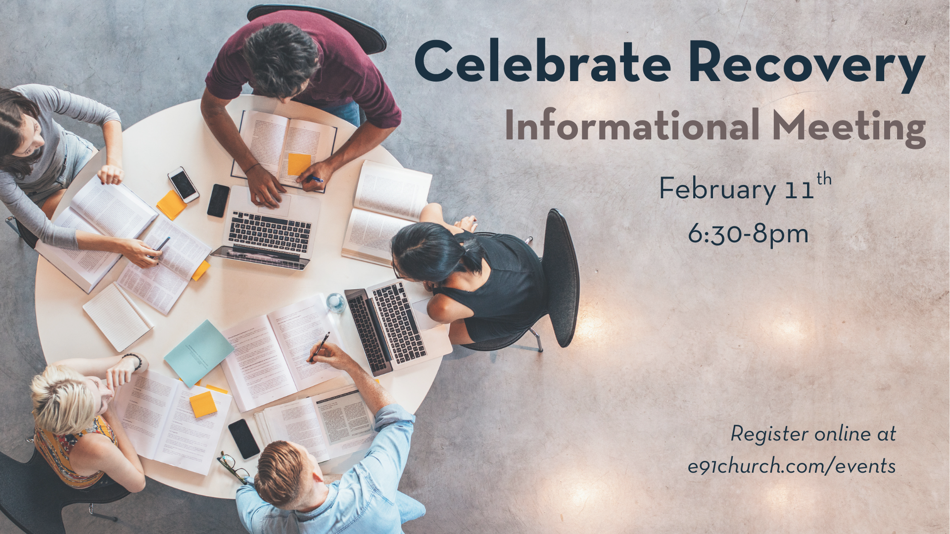 Please join us on February 11 to learn more about Celebrate Recovery and the future of the program at E91. This meeting is to gather people to learn about the program and discuss our next steps, which will include a “Step Study” and learning the principles of Celebrate Recovery. Attending this meeting is not giving a committment to participating in the future, but simply exploring the our plan and the program!
